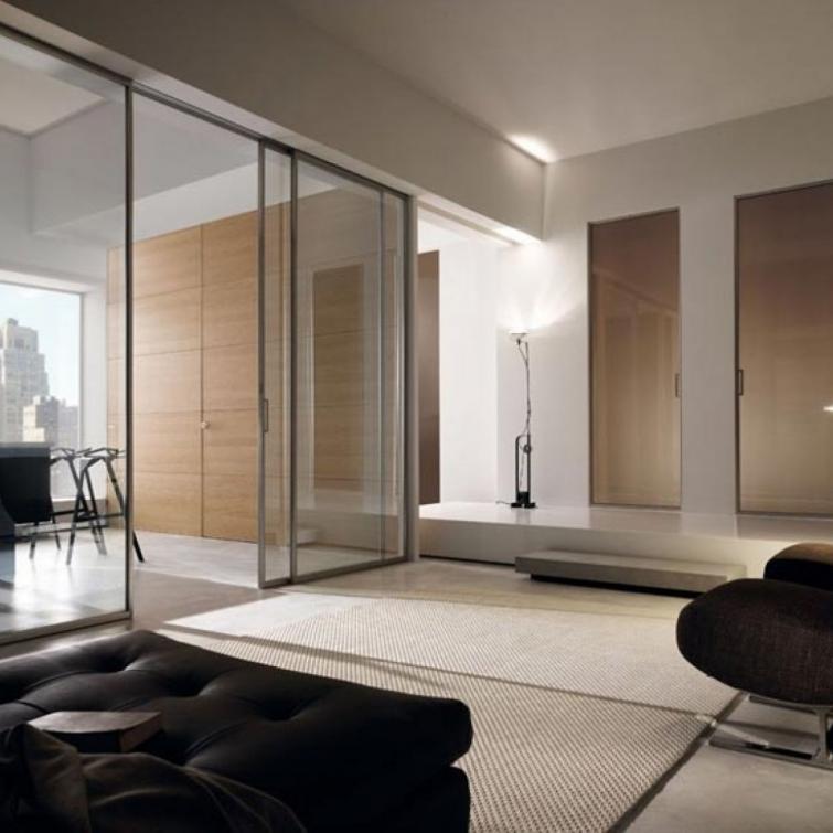 Le porte scorrevoli sono realizzabili in tanti materiali e finiture come legno, laminato, laccato RAL lucido o opaco, acrilico, alluminio, vetro, e loro combinazioni.