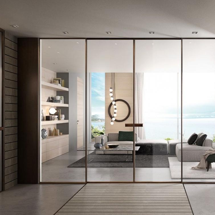 Con una porta scorrevole a scomparsa doppia o a più ante, potrai limitare a tuo piacimento ampi vani (per esempio tra cucina e soggiorno) , scorrendo su due o su un solo lato, sia con telaio e coprifili, che senza (Essential).